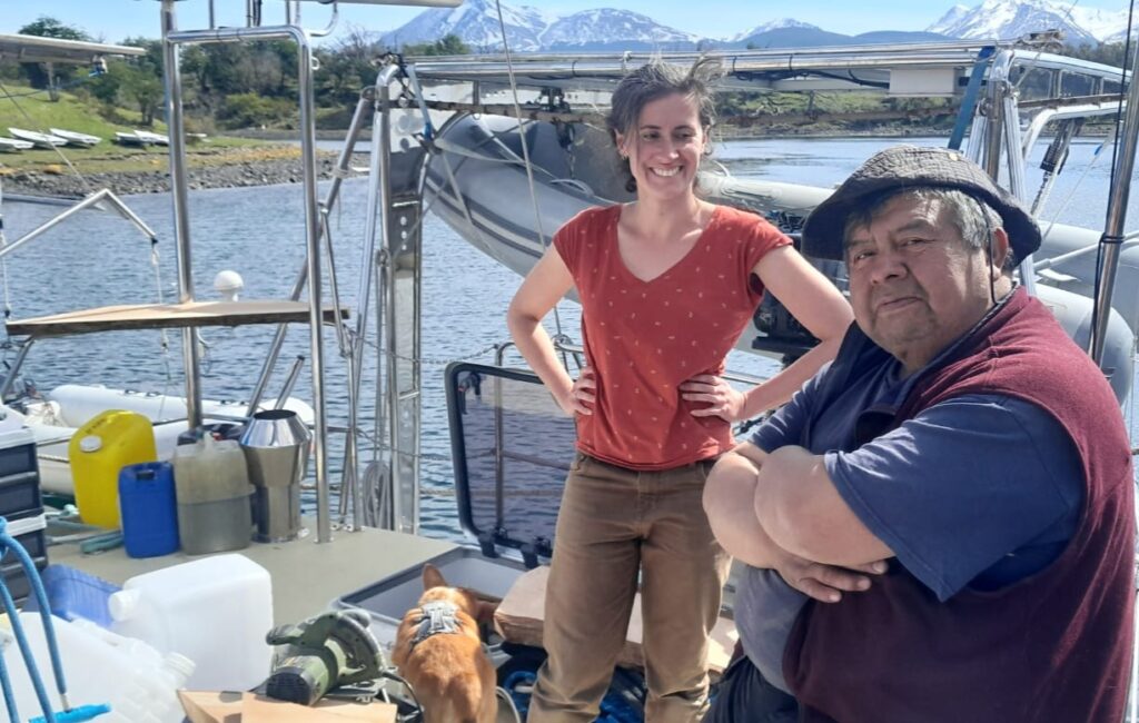 Lauriane y José a bordo de Milagro, con un primer plano de trabajo en coigüe en el balcón trasero a estribor.