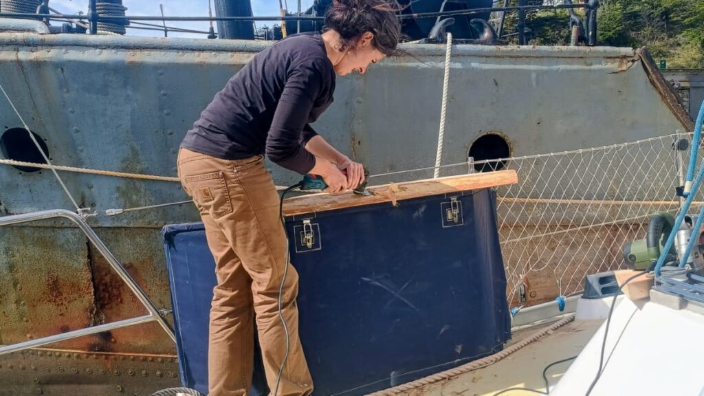 El lunes 27 de octubre, el Milagro vibró al ritmo de la madera de coigüe y las herramientas. Con José, miembro de la tripulación y padrino del barco, dedicamos el día a una sesión de carpintería tradicional para fabricar dos nuevas superficies de trabajo con madera de coigüe. Estos nuevos equipamientos, ahora instalados en la popa del velero, se utilizarán para limpiar los peces y levantar las redes en el exterior, en perfecta armonía con el mar y el viento. A bordo, el aroma de la madera recién cortada se mezcló con el de las mareas cambiantes. El acabado se realizó con hacha, sierra vibratoria y finalmente una amoladora.